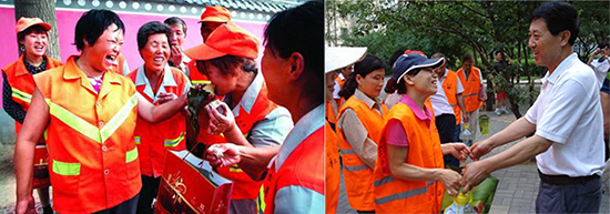 端午將至,農(nóng)歷的五月初五這天的一大早,舒特通州區(qū)保潔發(fā)現(xiàn)活動(dòng)現(xiàn)場(chǎng)的桌上就擺好了社區(qū)工作人員準(zhǔn)備好的粽葉、糯米、紅棗、細(xì)繩等食材和工具。舒特還了解到社區(qū)特意請(qǐng)了一位包粽子包得很好的居民給大家教授方法。在居民及志愿者的共同學(xué)習(xí)觀摩中,粽子葉、糯米和棉線經(jīng)過快、準(zhǔn)、巧的包扎,都出落成了像模像樣的粽子。一旁社區(qū)老年培訓(xùn)班的學(xué)員也來助興,他們?yōu)榫用駧砹嗣晒盼琛⒋蠛铣?、葫蘆絲演奏等熱鬧紅火的文藝節(jié)目。兩個(gè)多小時(shí)后,在大家的共同努力下,近千只粽子新鮮出爐。居民們提著新鮮的粽子,來到了社區(qū)低保家庭、空巢老人、殘疾貧困家庭以及轄區(qū)工作在一線的保安與保潔環(huán)衛(wèi)工人身邊,將剛包好的粽子送給他們,社區(qū)的舉辦此次活動(dòng)的初衷就是希望他們也過上一個(gè)快樂幸福的端午節(jié)。